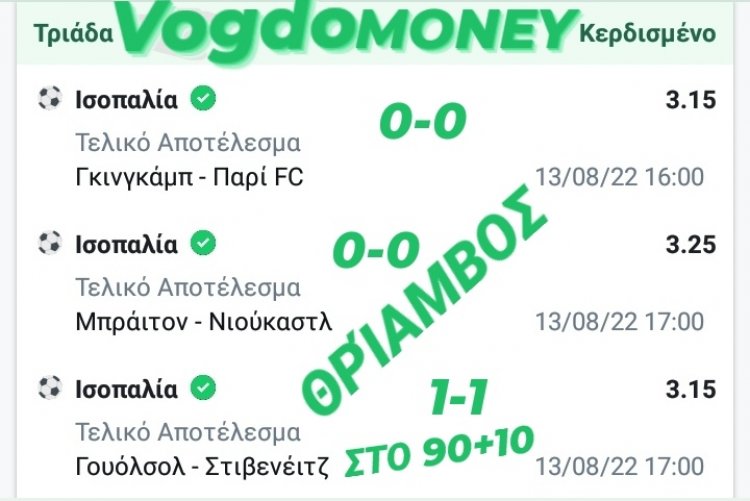 Καλησπέρα κύριοι, μια επική νίκη με 3 στις 3 καρφωτες ισοπαλίες σε απόδοση 32.2 μας χάρισε στο 90+10 η Στηβενειτς καθώς στο τελευταίο ουσιαστικά παιχνίδι που περιμέναμε η Γουοσλοου προηγούνταν από πολύ νωρίς με 1-0 και ενώ το παιχνίδι πήγαινε προς την λήξη του ο διαιτητής δείχνει 7 λεπτά καθυστέρηση,και το περίεργο εδώ είναι ότι ενώ πέρασαν τα 7 λεπτά το παιχνίδι πήγε στο 100 λεπτό όπου και ισοφάρισε η φιλοξενουμενη ομάδα και μας χάρισε ένα από τα ωραιότερα ταμεία των τελευταίων ετών. Στις άλλες 2 ισοπαλίες δεν κουνήθηκε φύλλο καθώς τα παιχνίδια τελείωσαν σβηστά με σκορ 0-0.