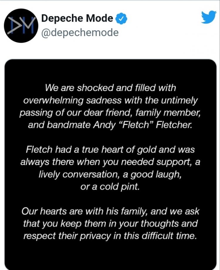 Δυστυχώς ο Andy Fletcher δεν υπάρχει πια καθώς όπως ενημέρωσε η ίδια η μπάντα επιβίωσε χθες 26 Μαΐου χωρίς να δώσει περισσότερες πληροφορίες για τις συνθήκες του θανάτου του.
